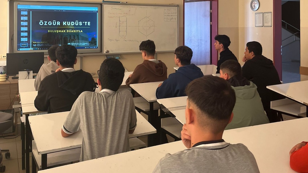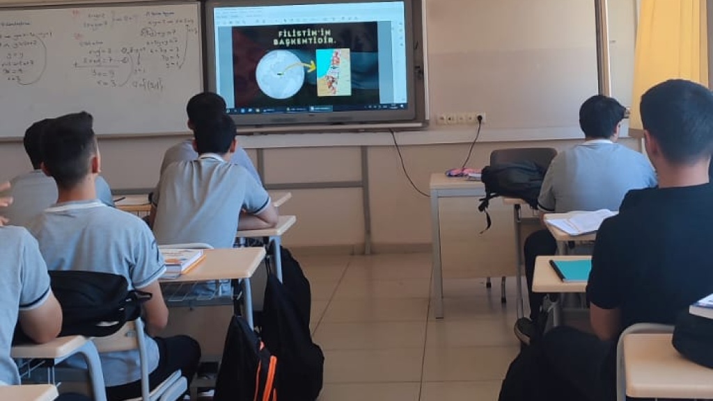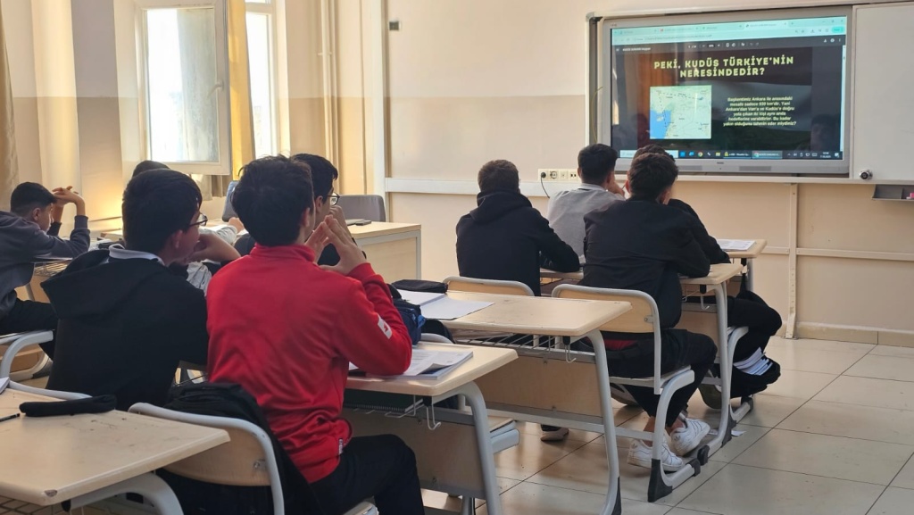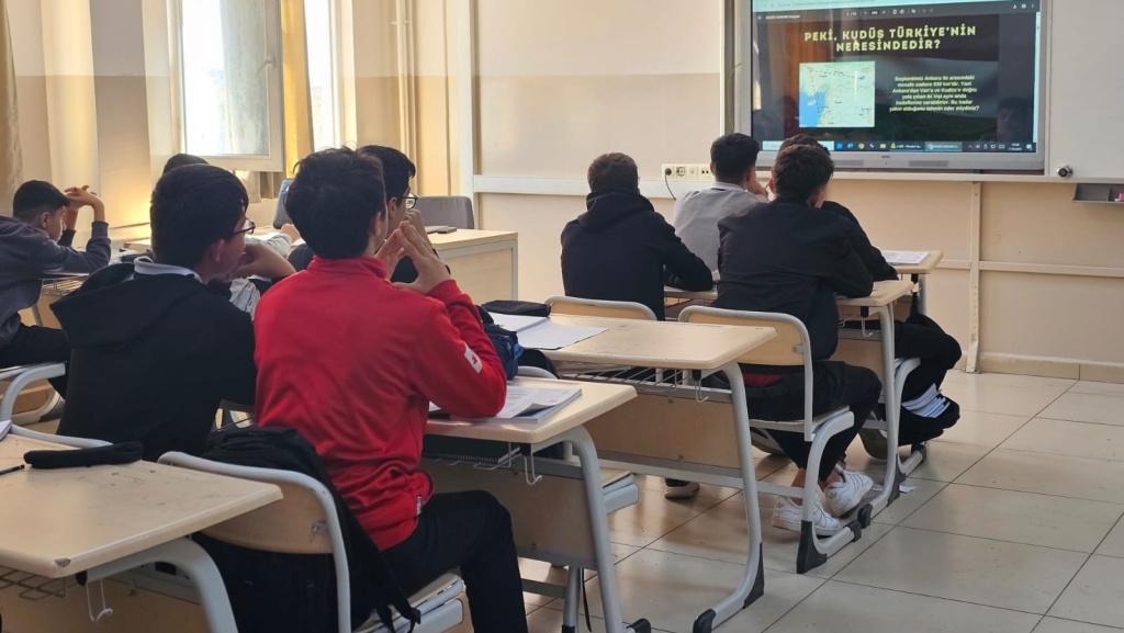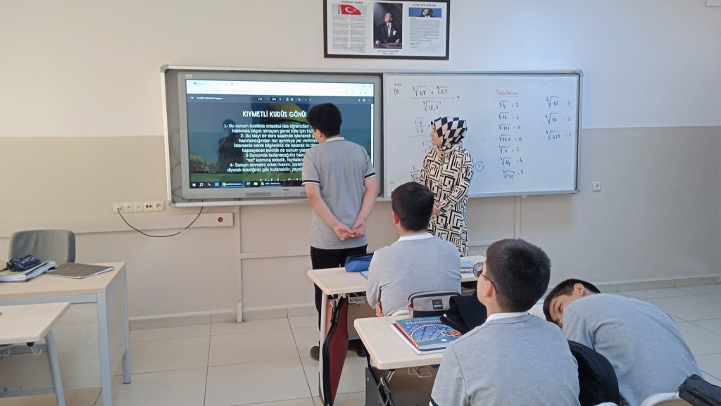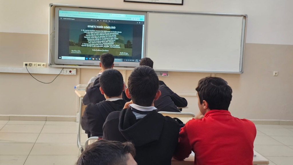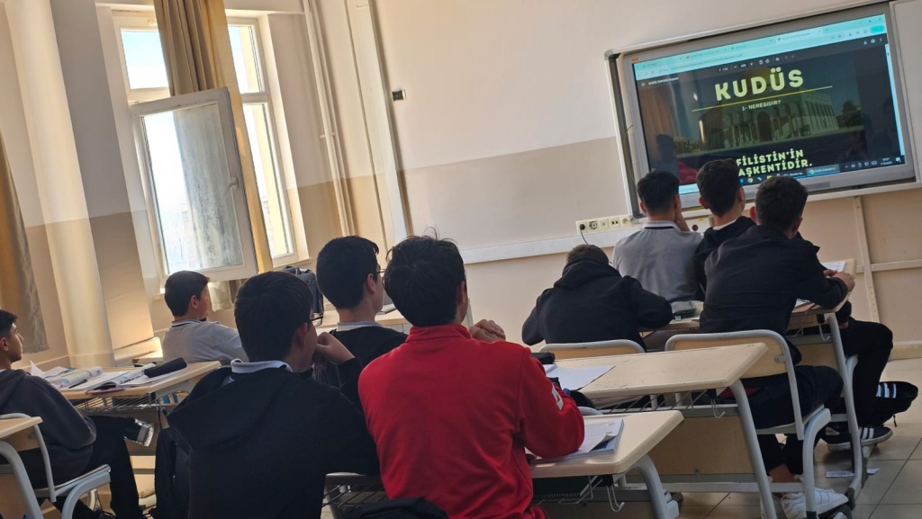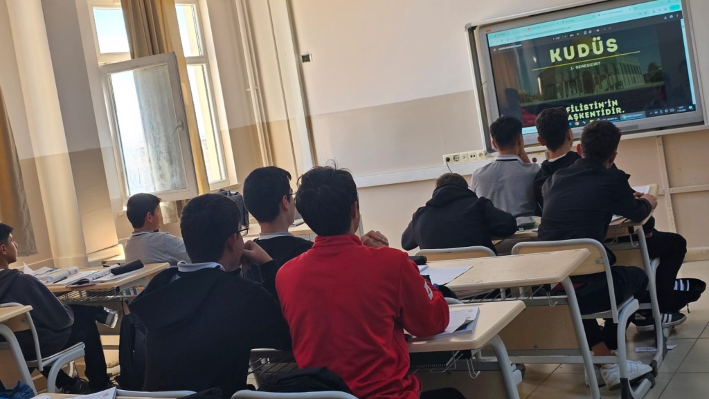Derslerde öğretmenler, “Kudüs ve Gazze” temalı sunumlarla öğrencilere bölgenin tarihi, Mescid-i Aksa’nın önemi ve Filistin halkının yaşadığı zorluklar hakkında bilgiler verdi. Akıllı tahta üzerinden yapılan görsel sunumlarda öğrenciler, Filistin topraklarının yıllar içinde uğradığı işgali gösteren haritalar eşliğinde konuyu dikkatle takip etti.